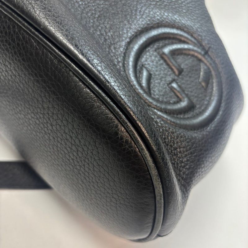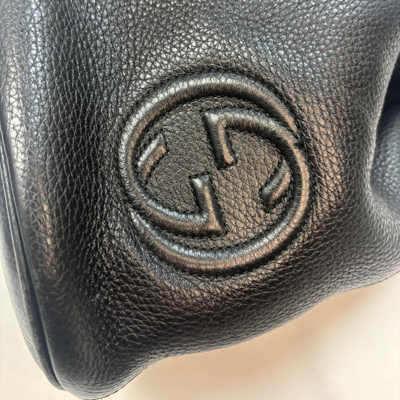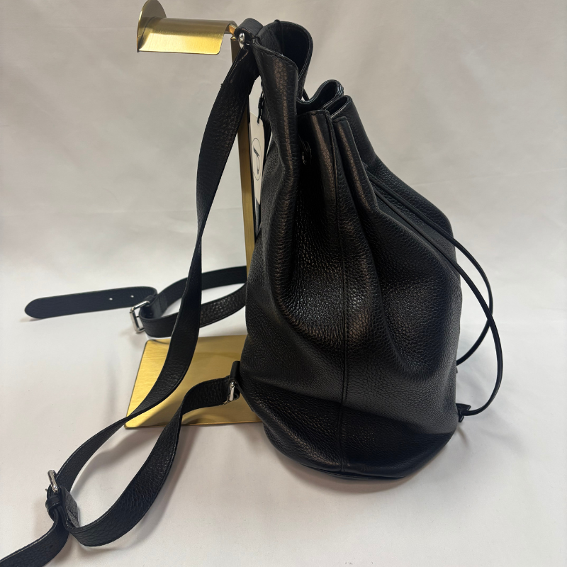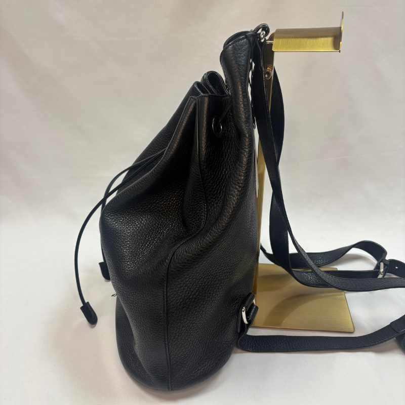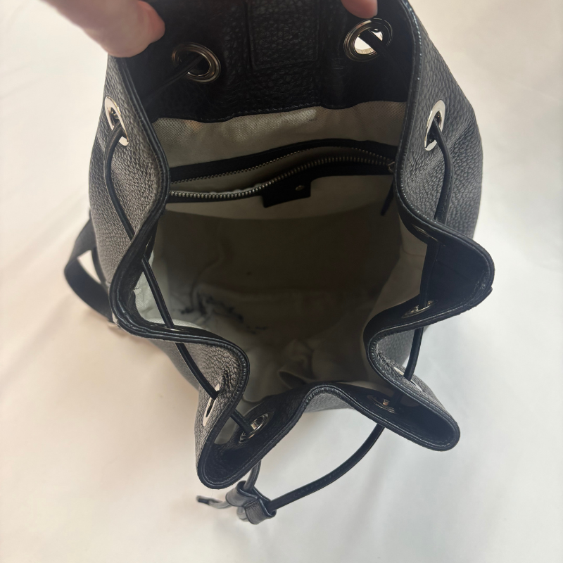 This super-chic large backpack is crafted of pebbled calfskin in black. The bag features leather shoulder straps, leather cinch cords and silver hardware. This stylish backpack opens to a spacious beige fabric interior with a zipper pocket. Enterior leather in great condition, interior in decent condition - looks new except for an area of ink stains, shown in picture.